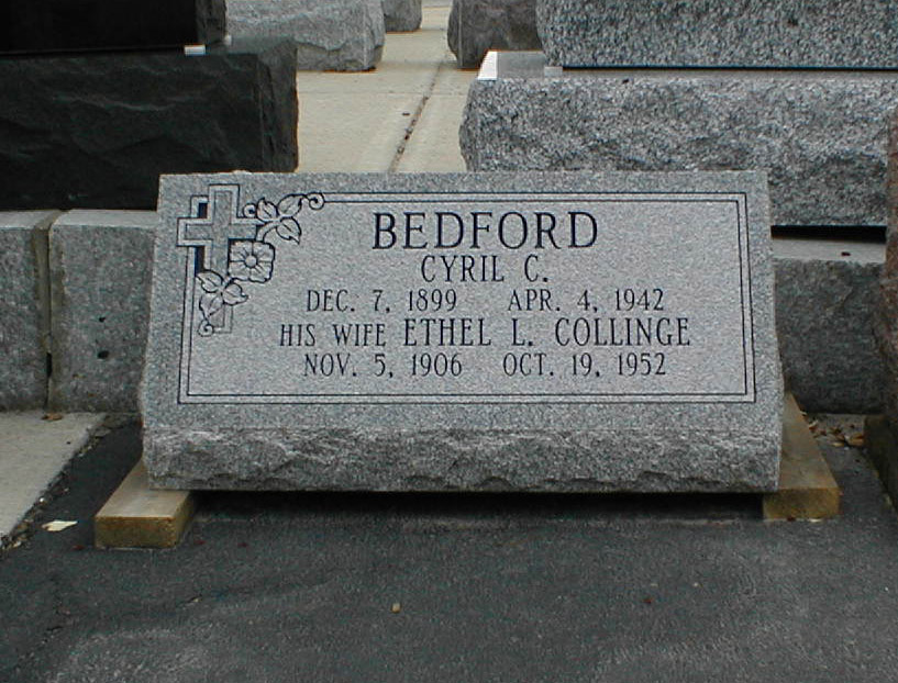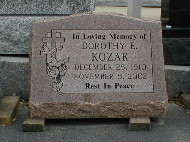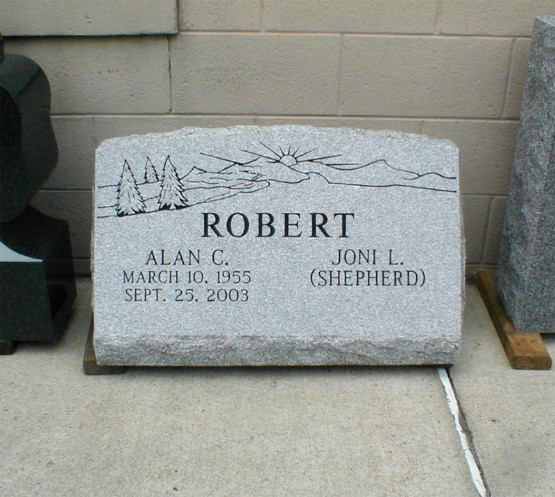 Slant Markers are upright memorials that are wide at the bottom (10" thick) gradually narrowing to 3" at the top. This style memorial can be set directly on a cement foundation or you can purchase a granite base separately. The most common individual size is 2' in length, 10" wide at bottom and 1'6" in height. Companion size: 3' long, 10" wide and 1'6" in height. Please note: Some dealers sell slants that are 14" tall, all our slants are 18" tall. Bevel Markers are typically 6 or 8" thick at the back with a 2" taper to the front. The most common individual size is 2' in length by 1' by 6". The most common companion size is 3' by 1' by 6". Marker designs can be flat sandblasted, or laser etched . Check with the cemetery regarding their rules and restrictions about size and content. We can carve most approved lettering, designs on any color slant or bevel. All our marker quotes include design, large family name, given names and sets of dates. Click on any image for a larger view. |
